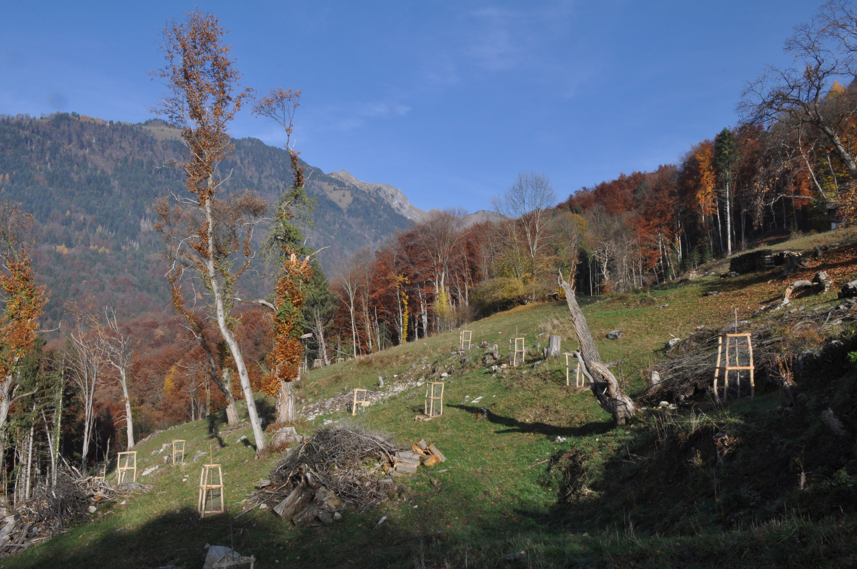 An area of 24,000 m2 was cleared, involving the cutting and removal of 940m3 of forest trees, while preserving the old chestnut trees. The soil was then seeded with grass, and the chestnut groves must be grazed or mown to prevent forest invasion. 142 young chestnut trees were planted and protected, and they began to produce fruit.